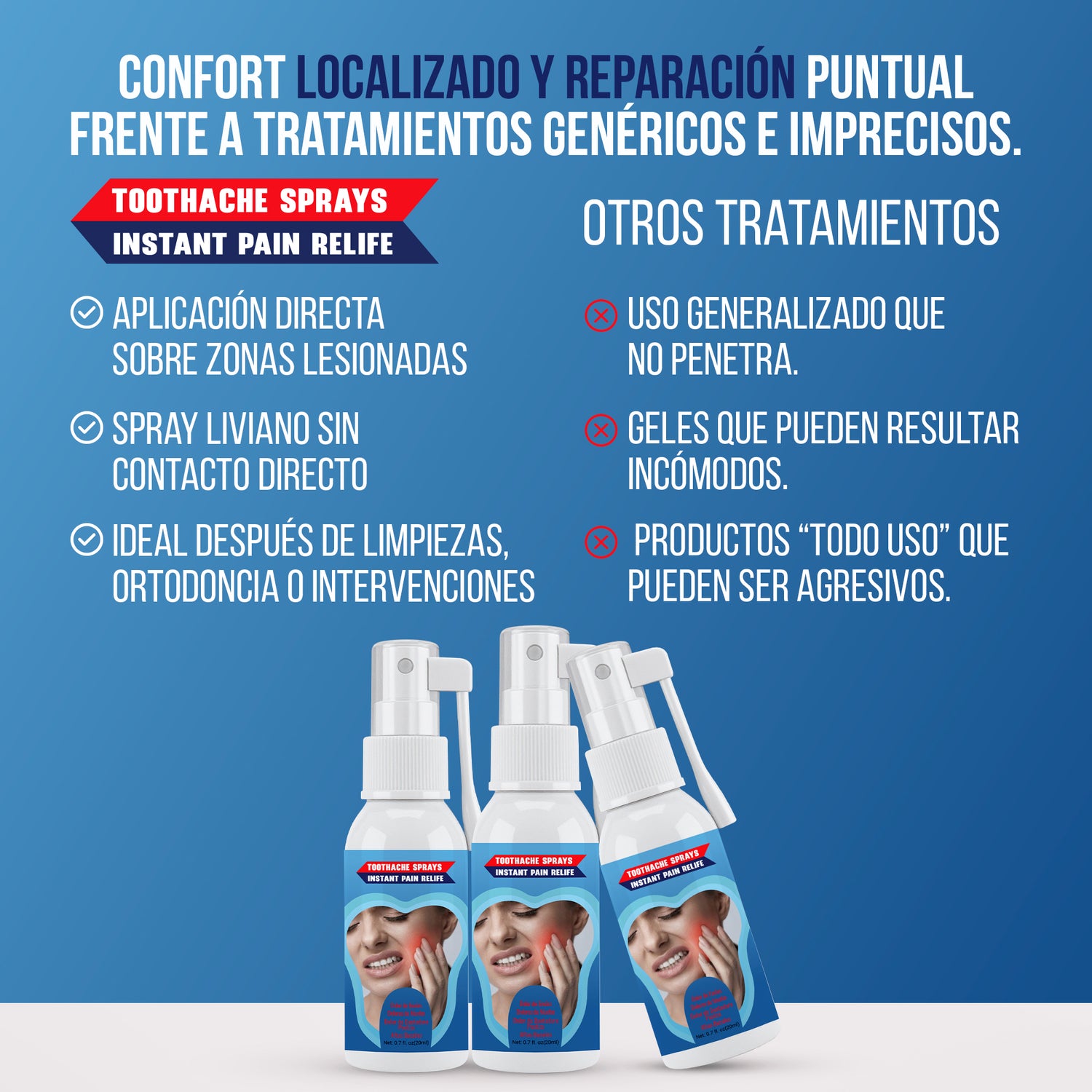 El spray Tooth Relief Spray™ cuenta con propiedades calmantes que mantienen el alivio durante horas, reduciendo tanto la sensibilidad como el ardor o la hinchazón. Su fórmula libre de alcohol y compuestos agresivos lo hace seguro para toda la familia, incluyendo adultos mayores o niños con molestias dentales.